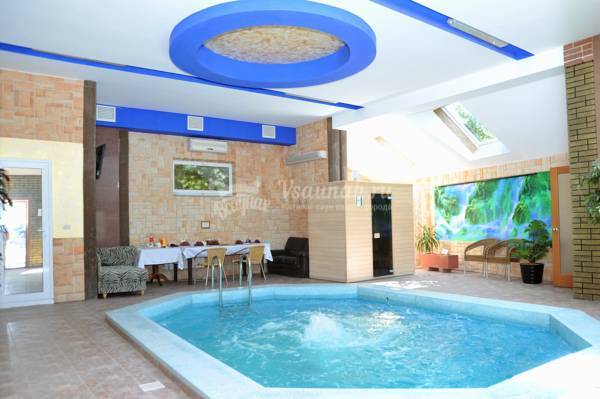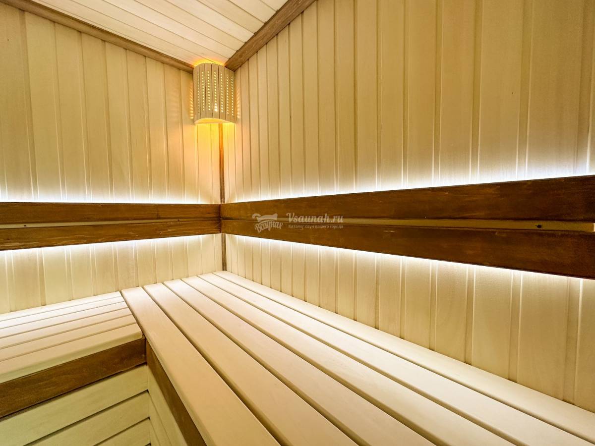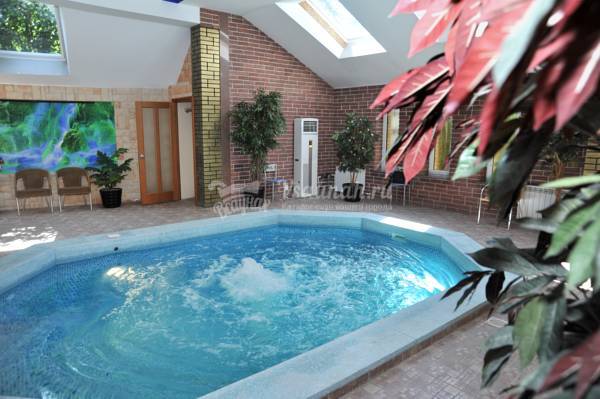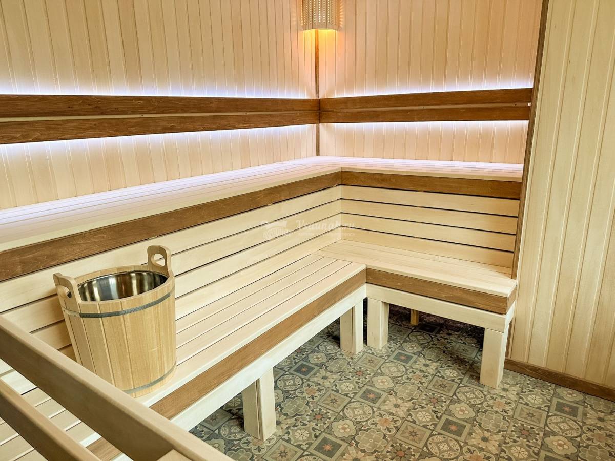 В русской бане предусмотрен бассейн с гейзером, а также сауна обустроена обливным ведром с холодной водой.
